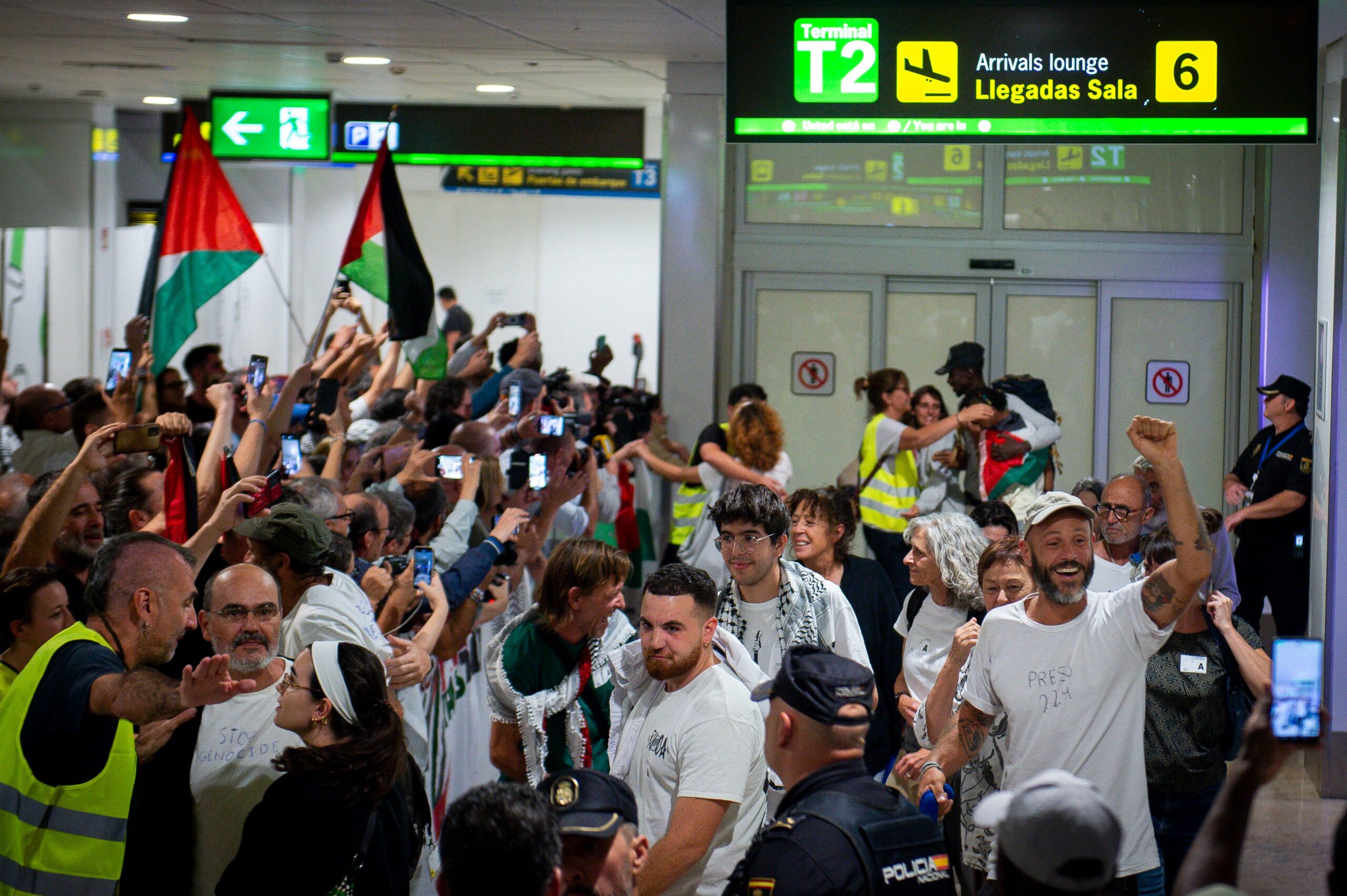 Un segundo grupo de españoles pertenecientes a la Global Sumud Flotilla ha aterrizado en el aeropuerto Adolfo Suárez de Madrid-Barajas este lunes, pasadas las once de la noche. Se suman así a los 21 —sobre un total de 49 españoles— que regresaron el domingo a España tras pasar varios cuatro días presos en Israel. Las autoridades israelíes deportaron este lunes hacia Atenas a 27 españoles. Desde allí, un avión A400M del ejército español trasladó a varios de ellos a Madrid, mientras que otros dos aviones comerciales transportaron a sendos grupos hacia Barcelona y Bilbao. En total, son ya 48 españoles los que han regresado (los 21 del domingo y los 27 de este lunes). Pero aún continúa retenida en Israel la activista Reyes Rico, acusada de haber mordido el domingo a un funcionario de prisión. Rico tendrá que comparecer el miércoles ante la Policía israelí.