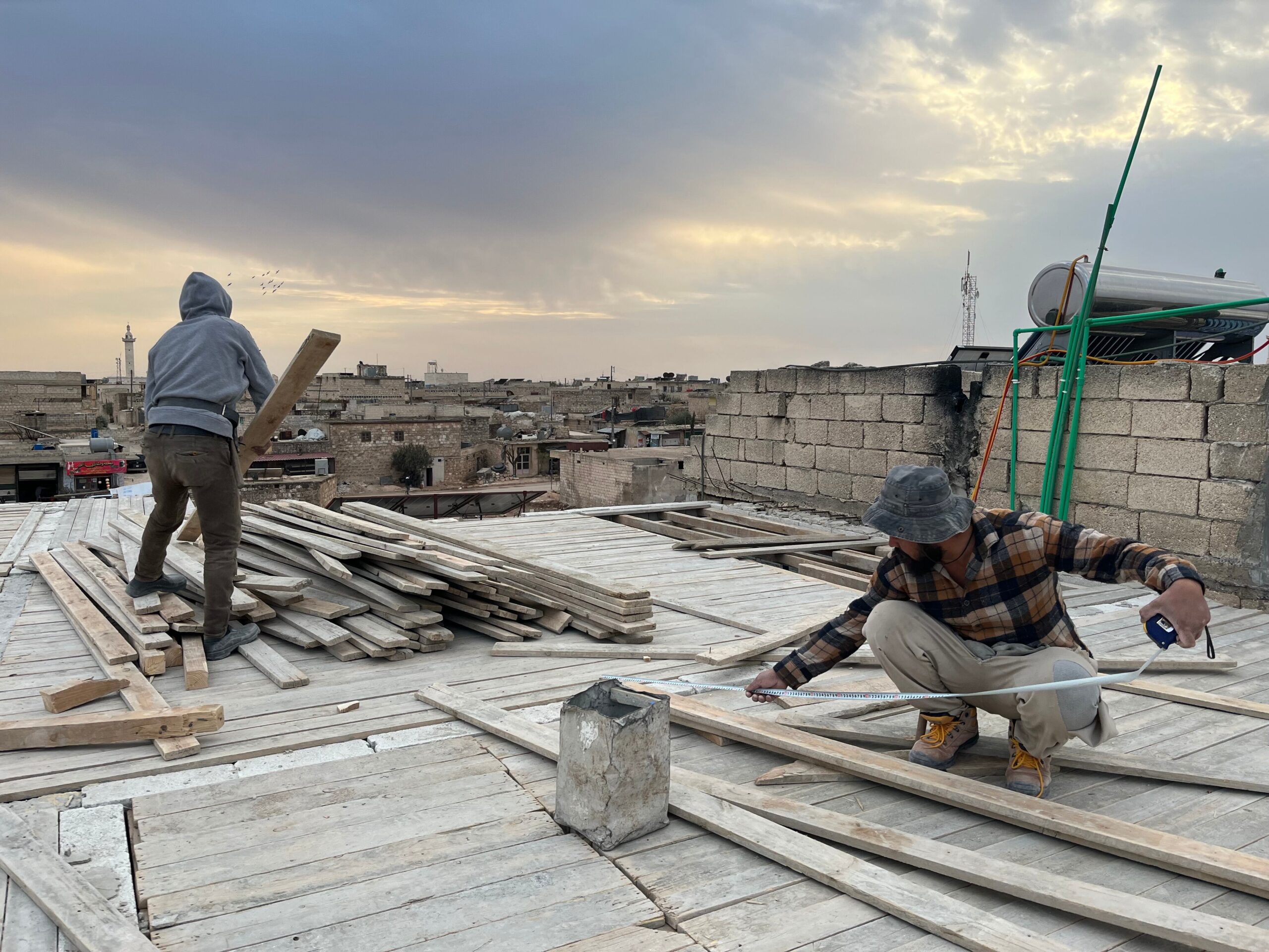 Dos obreros trabajan para añadir un piso al edificio familiar de Mustafa Al Atrash, en Deir Yamal, en el norte de Siria, el pasado día 5 de diciembre.